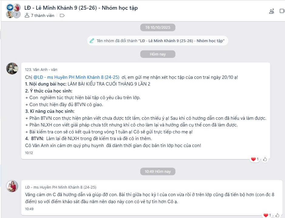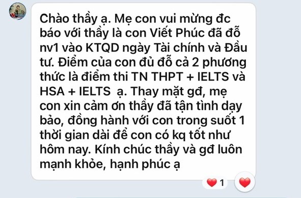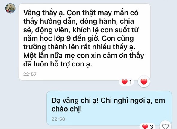 Con nhà chị thật may mắn khi có thầy hướng dẫn, đồng hành và chia sẻ, động viên, khích lệ con suốt năm học lớp 9 đến giờ. Con cũng trưởng thành lên rất nhiều thầy ạ. Một lần nữa mẹ con xin cảm ơn thầy đã luôn hỗ trợ con ạ.