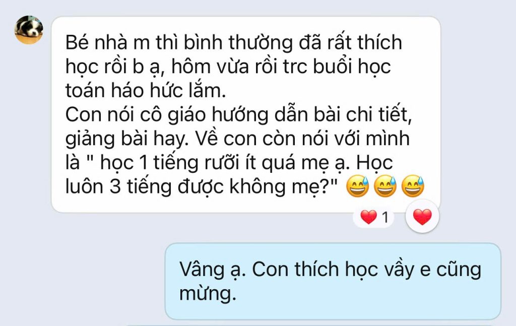 Bé nhà mình bình thường đã rất thích học rồi, hôm vừa rồi trước buổi học toán báo hức lắm. Con nói cô giáo hướng dẫn bài chi tiết, giảng bài hay. Về còn nói với mẹ là: \"Học một tiếng rưỡi ít quá mẹ ạ. Học luôn 3 tiếng được không mẹ?\"
